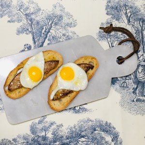 Freír los huevos, poner cada uno sobre cada tostada de jamón… ¡y listo!