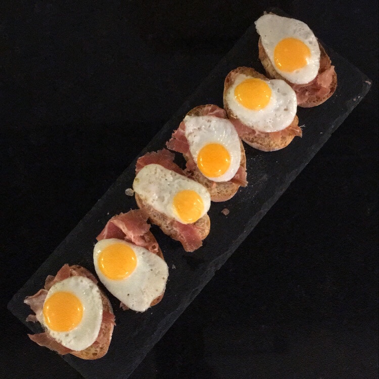 Montaditos con jamón y huevos de codorniz (6 montaditos)
