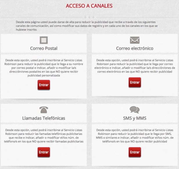 Una vez accedes te permite apuntarte personalmente a la lista. Una vez registrado, tienes que activar la cuenta accediendo a un enlace que se envía por correo electrónico y por último simplemente hay que entrar en la cuenta y seleccionar el canal o canales en los que No quieres recibir publicidad (llamada a fijo y/o móvil, sms, correo postal, correo electrónico,…).