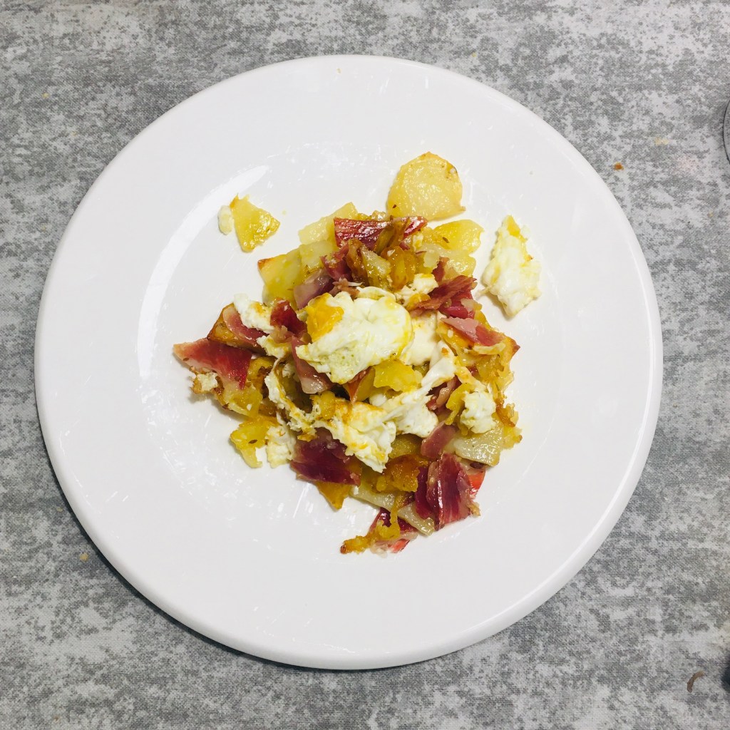 Freir los huevos, poner encima de las patatas, añadir el jamón y ¡listo!