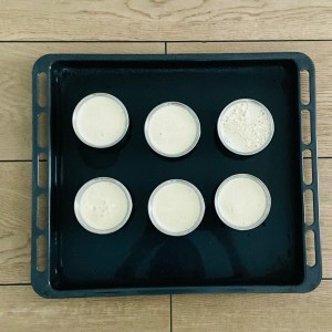 Poner en la bandeja del horno unos dos dedos de agua y colocar las flaneras.