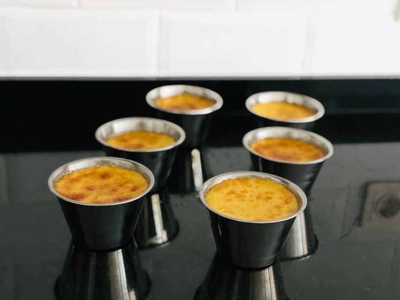Hornear al baño María a 180grados durante unos 30 minutos (hasta que pinchando los flanes con una aguja veas que sale seca).