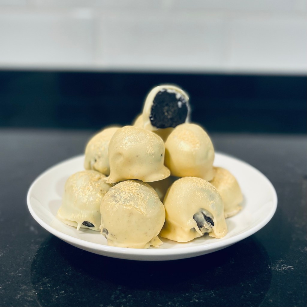 6. Bañar las botellas de oreo, colocar en una bandeja e ir decorando. Como las bolitas están frías, verás que el chocolate se enfría rápidamente. Así que si vas a decorarlo con algo que quieres que se pegue a la superficie, te recomiendo que lo vayas haciendo conforme las vas teniendo.